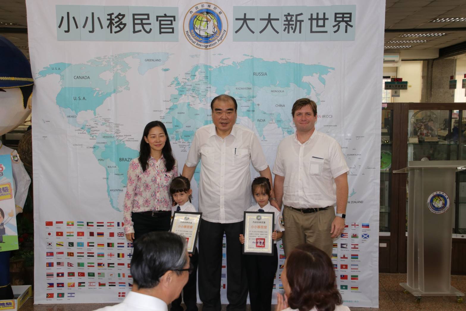 父親來自美國的新住民二代雙胞胎莎拉(Sarah)跟漢娜(Hannah)打扮俏麗,是現場的人氣王,雖然才6歲,外型活潑可愛已是服飾廣告的寵兒,也曾拍過桂格成長奶粉廣告,她們一出現就引起眾人驚呼「卡哇伊」。在報名的時候,問到她們長大後,想不想當移民官?外派到爸爸的故鄉美國,替大家服務?兩人異口同聲的表示「yes」!
