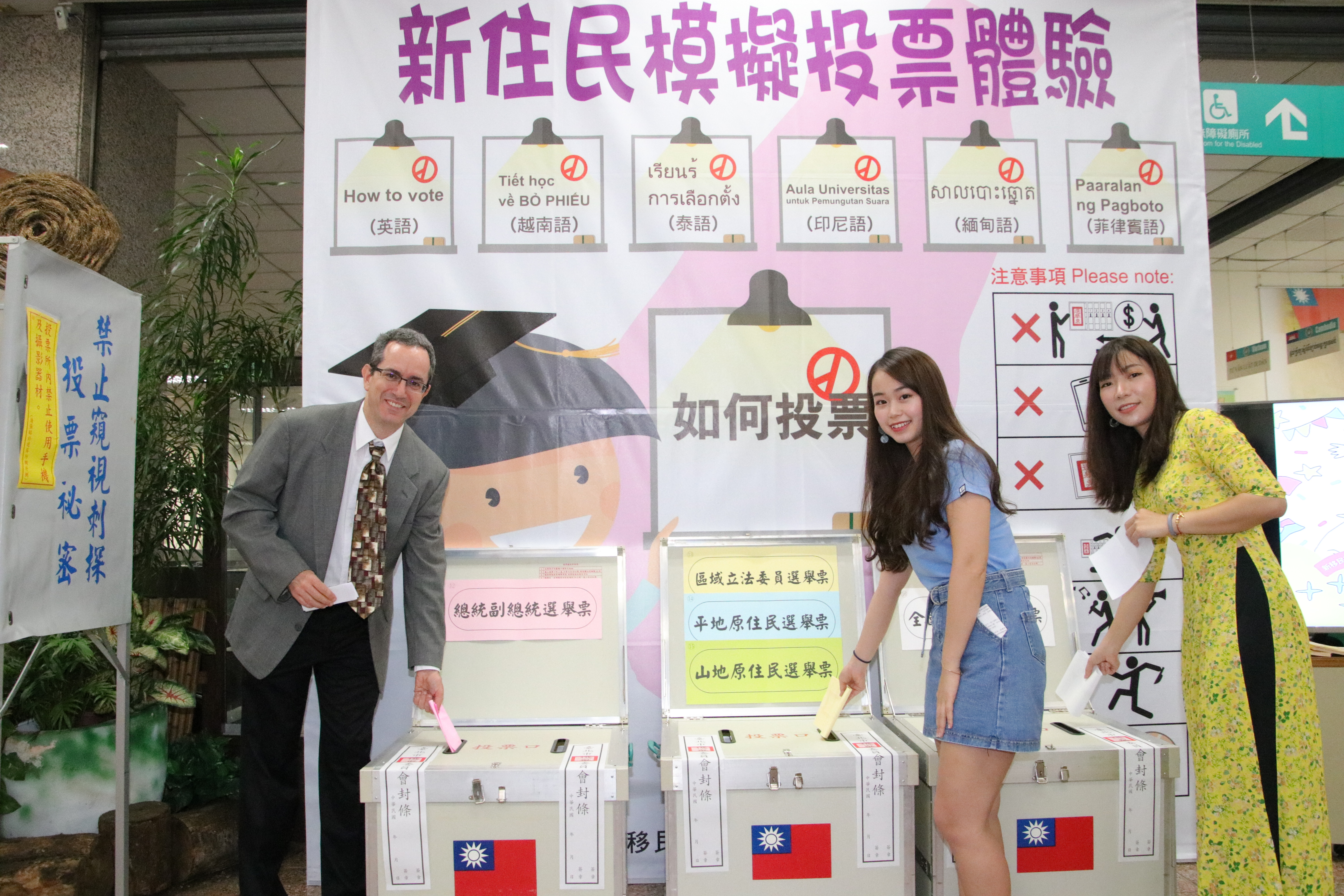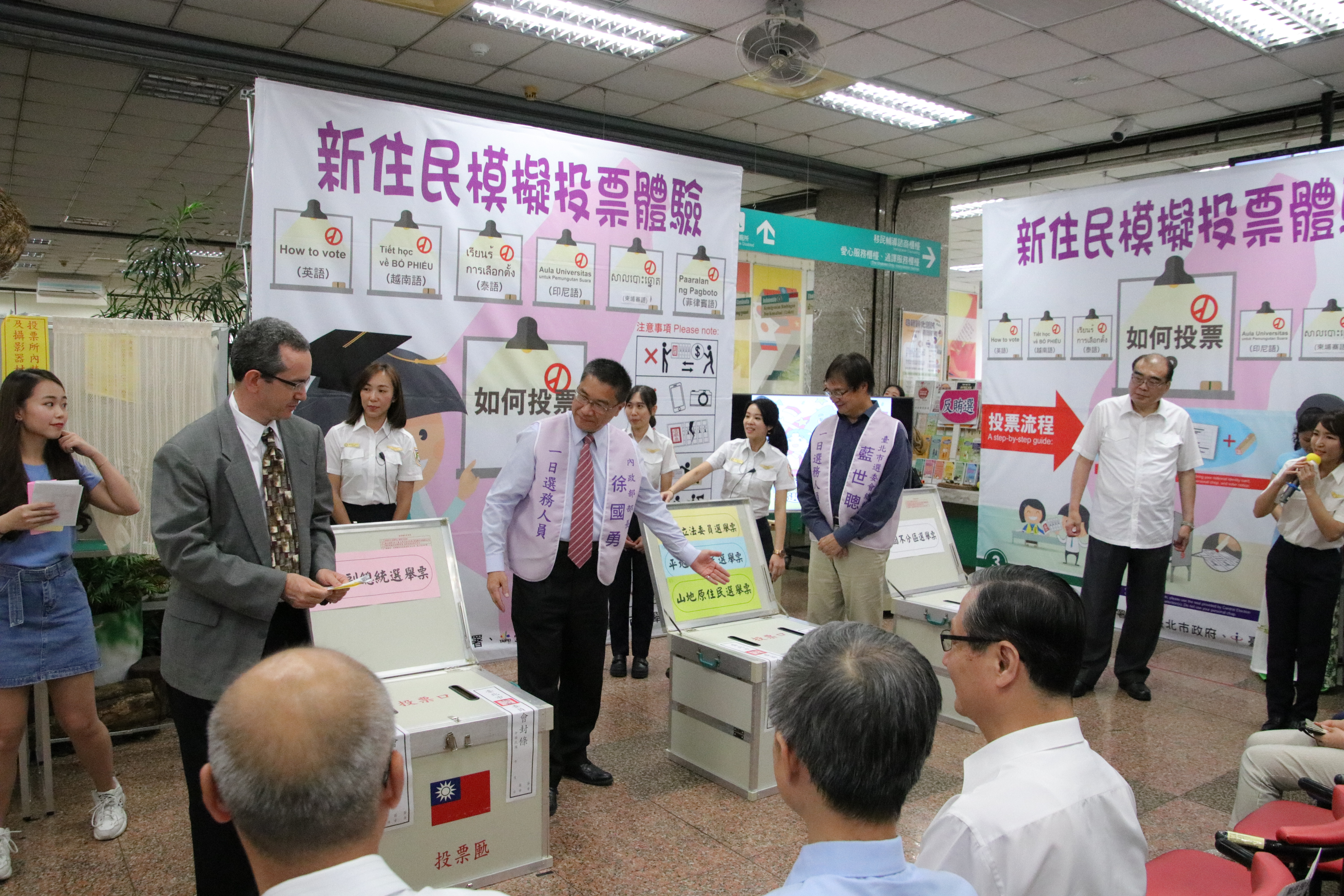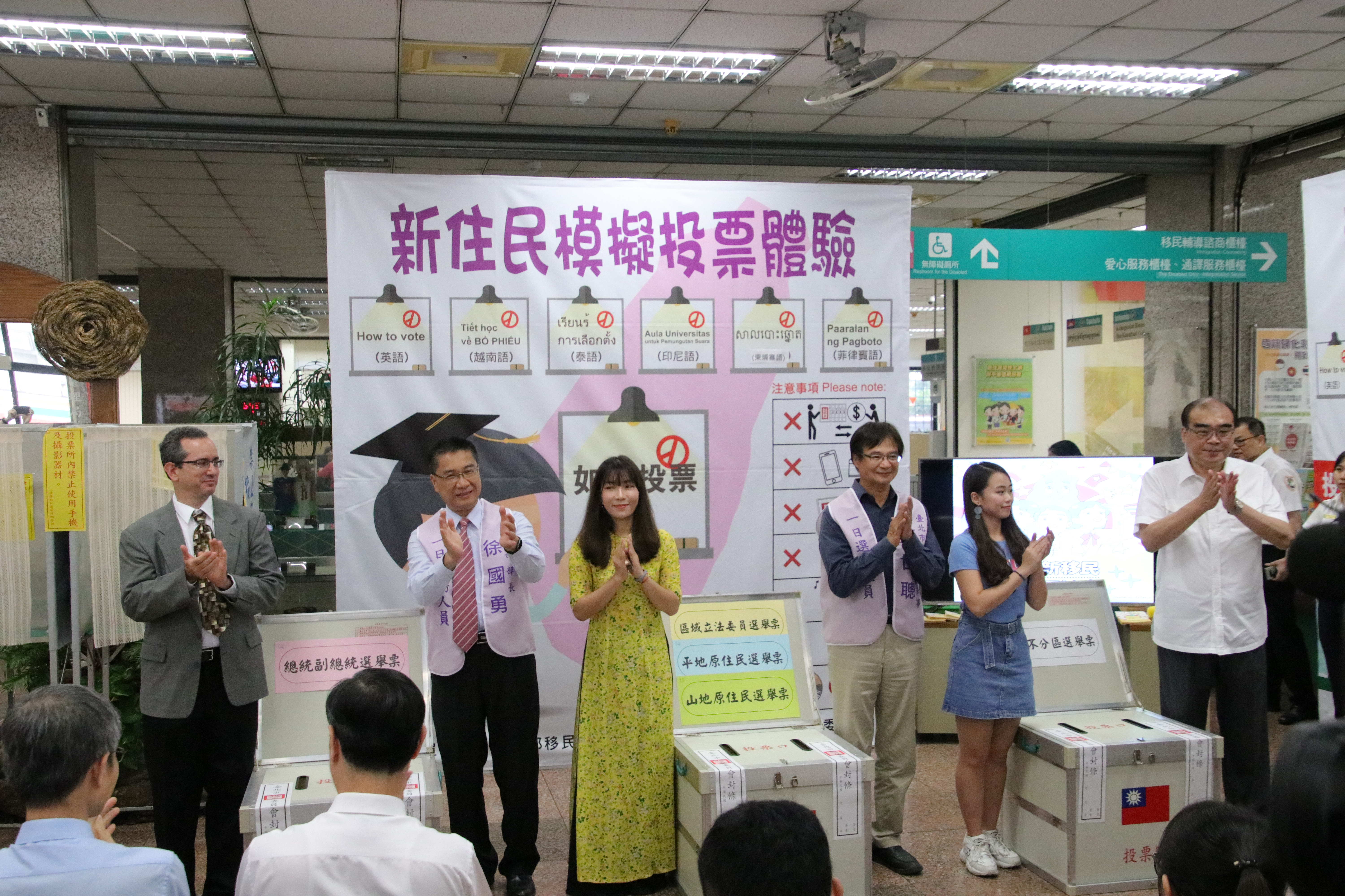 內政部移民署9月17日於一樓大廳舉辦「新住民模擬投票體驗」活動,內政部長徐國勇、移民署署長邱豐光及臺北市選舉委員會總幹事藍世聰、化身「一日選務人員」實際操作臺灣投票的民主過程。活動參加者中,今年5月初設戶籍、取得身分證的中研院院士余文生成了明年總統、副總統及立法委員的「首投族」,他很開心能投下民主神聖的第一票!
