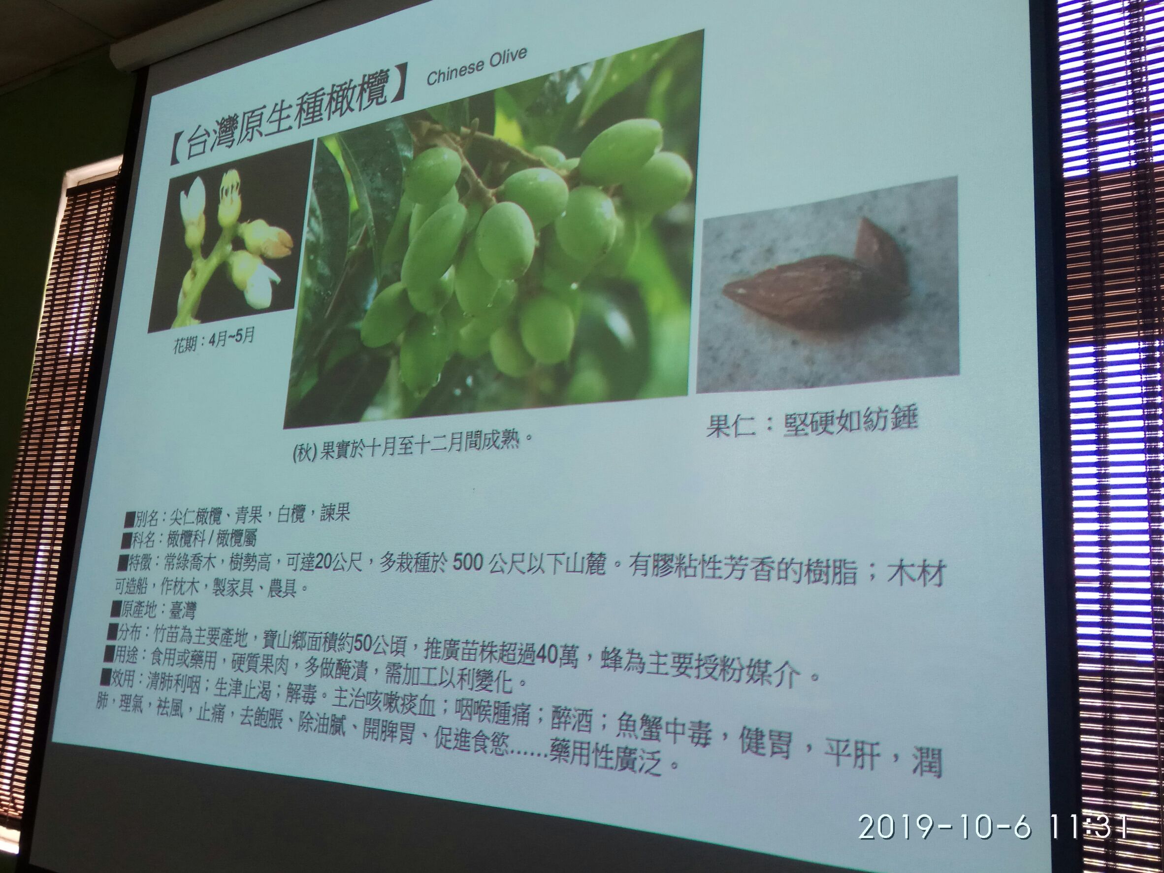 學習參訪橄欖先生社區產業導覽,讓當日與會同學了解到橄欖樹的成長生態,並透過園區的現場學習解說能力與技巧;橄欖樹主要區分二大類型,原生種尖仁橄欖別名青果又稱諫果、忠果等,這是因它初吃時味澀久嚼後,香甜可口,餘味無窮,比喻忠諫之言先苦後甜的特别韻味。有同於古代忠臣苦諫的性格稱名的橄欖(Canarium album Raeusch.),為橄欖科植物屬常綠喬木,可高10米以上主產於台灣、福建、廣東、海南等地,核果卵圓形至紡錘形,果核兩端尖銳,於每年的秋季採收。