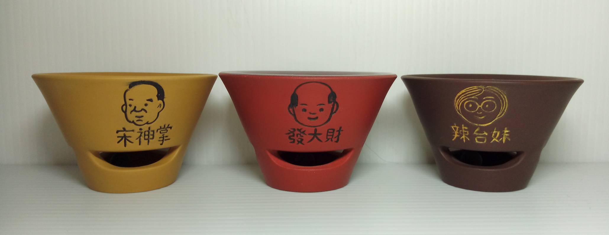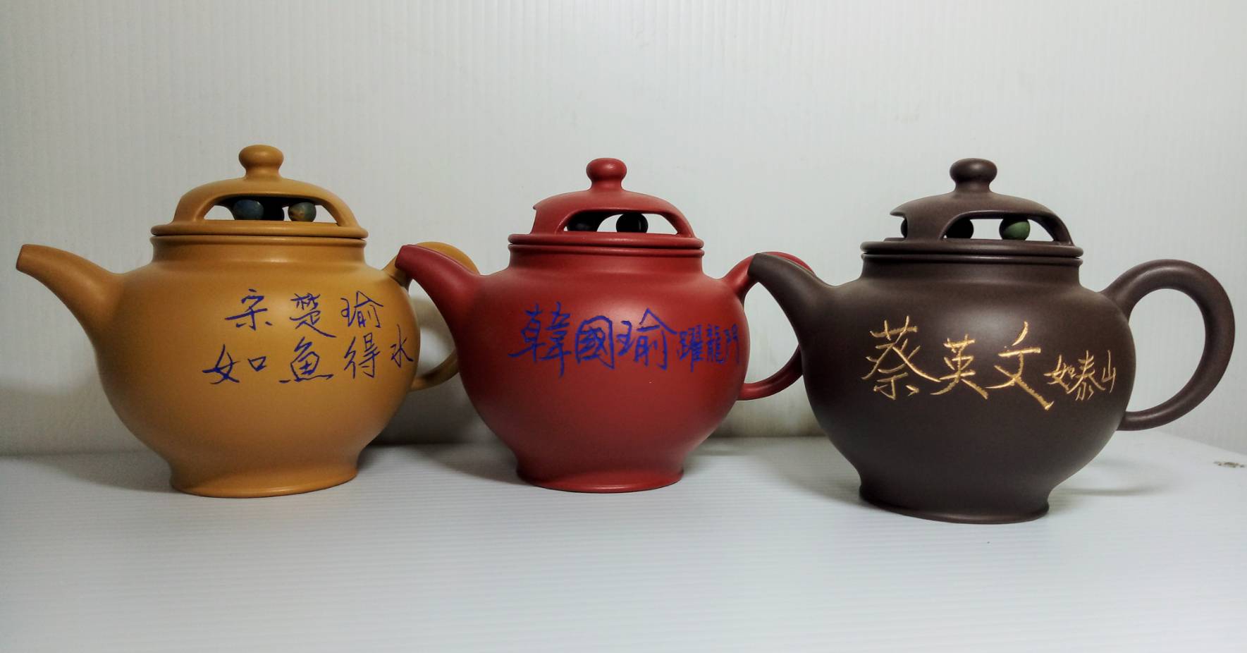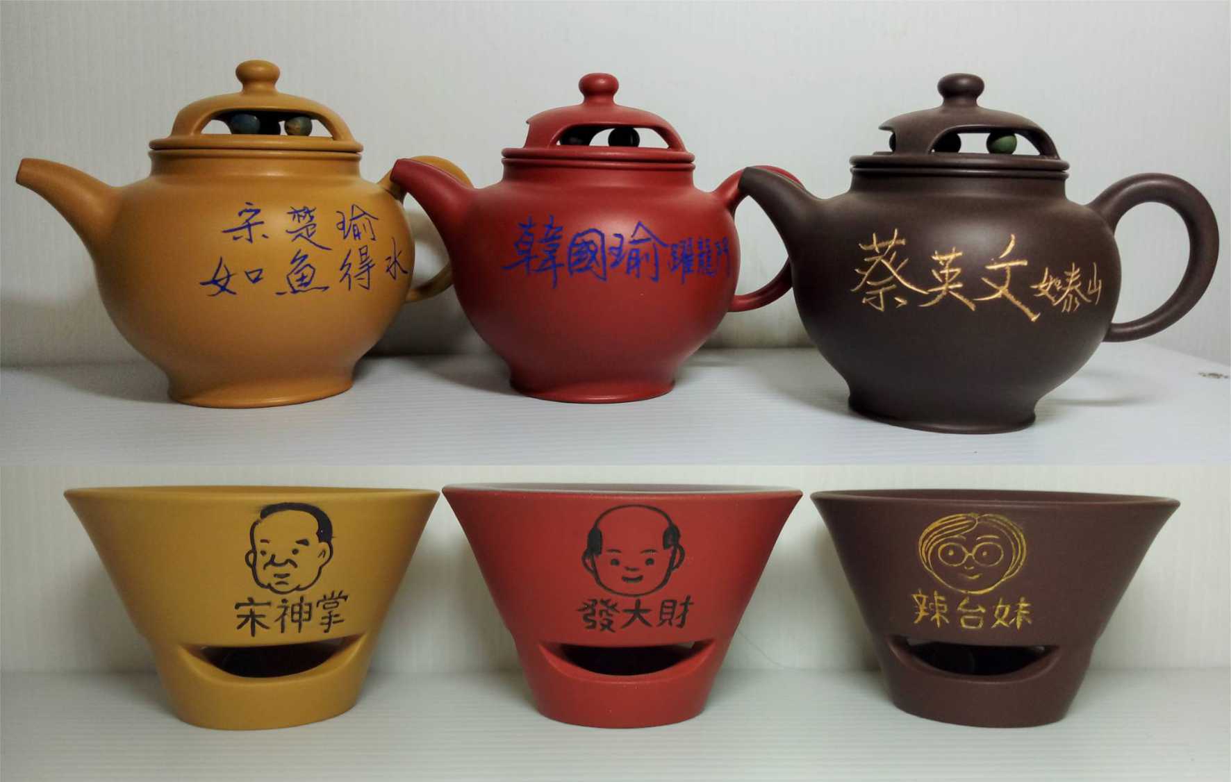阿通師(本名黃源通,54歲)現居鶯歌,15歲開始習陶多年,曾經多次參加陶藝競賽,獲獎多次。這次設計Q版2020總統大選紀念茶組「三腳督」宋、韓、蔡三黨候選人為創作發想,命名為「珍珠壺」茶壺、茶杯皆有陶珠滾動設計,象徵「財源滾滾,經濟繁榮」2020年難得典藏茶組,平價推出。