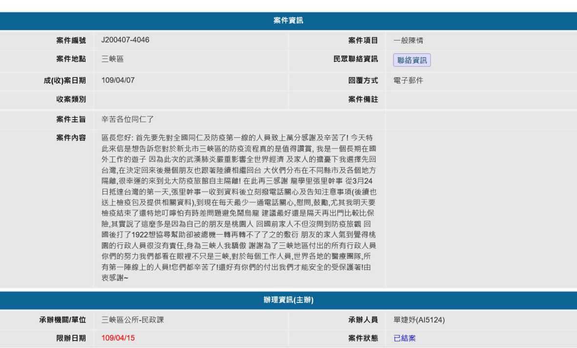 陳小姐在信件中表示:身為三峽人感到非常驕傲,感謝為了三峽地區默默付出的所有人員。不僅限於醫療相關體系、政府行政單位,對於每位參與防疫工作的團隊成員們,大家都辛苦了!幸好有您們無私的付出,人民才能安心的被保護著,有您們真好~
