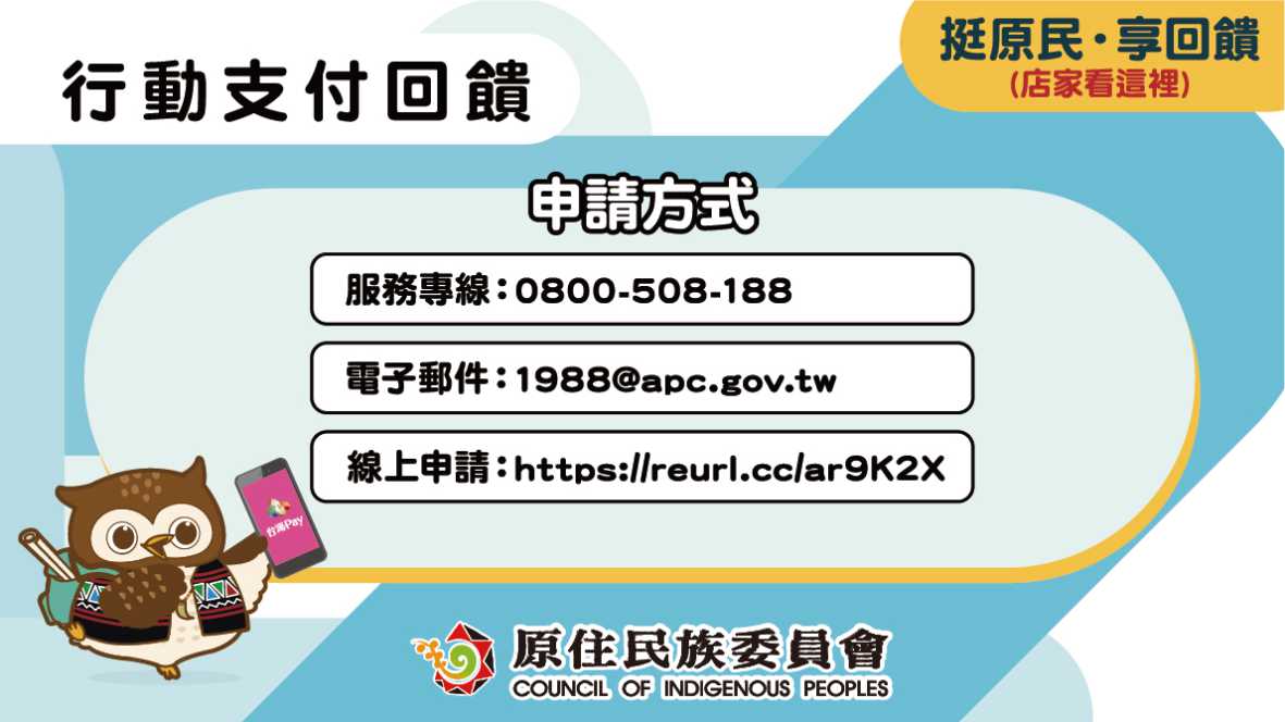 本次行動支付優惠方案將持續到110年6月30日止,只要您是原民店家,有統一編號並依法辦理的公司登記、商業登記、有限合夥登記、稅籍登記之本國營利事業,或依商業登記法第五條規定得免辦理登記之小規模商業(如攤販、家庭農林漁牧業者、家庭手工業者、民宿經營者)、合作社、民間團體或農業產銷班,符合資格者都可申請原民會「認證店家」,可透過網路(https://reurl.cc/ar9K2X)提出申請,或撥打服務專線:0800-508-188查詢。