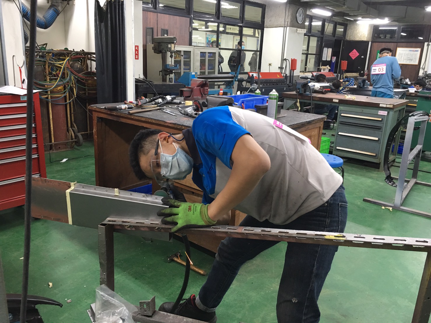 汽車板金選手陳柏達之前是本學院學訓合作班的學員,培訓期間表現優異,培訓老師肯定其天份進而鼓勵柏達挑戰自我參加競賽,柏達很感謝老師的賞識給他機會參與選手培訓,過程中的扎實訓練,讓柏達從原本的一無所知,到後來漸漸地累積足夠的實力,終於在北區分區賽嶄露頭角贏得金牌。