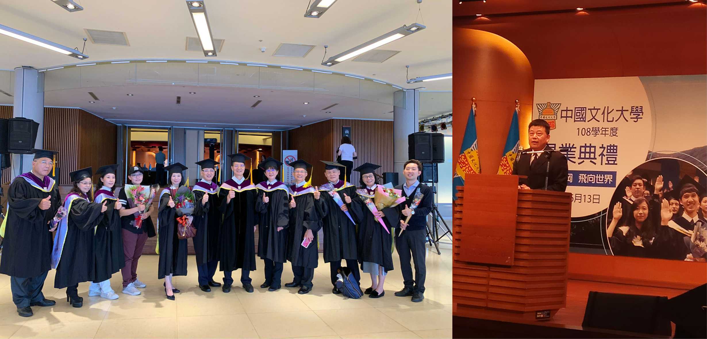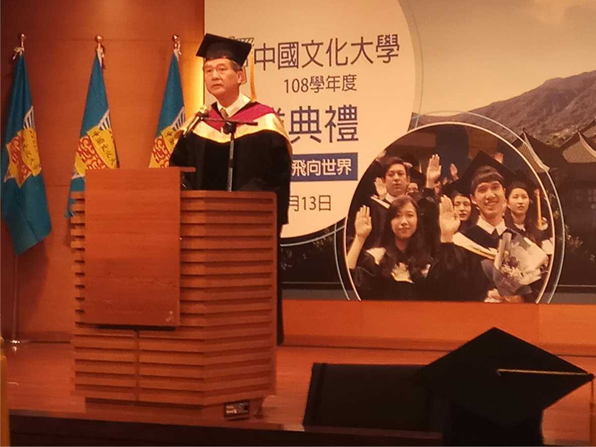 徐興慶校長說,文大致力國際化,目前在全世界的姊妹校已經達409所,全力協助同學拓展國際視野。他勉勵所有文大畢業生,都能勇於挑戰未來,成為一位向全世界訴說屬於自己故事的華岡人;並期盼大家畢業以後,持續保持吸收新知與技能的活力,也希望大家重人品、講信用,不要人云亦云、隨波逐流,要以創新思考,找出自己的長處,堅持自己的信念與人生價值。