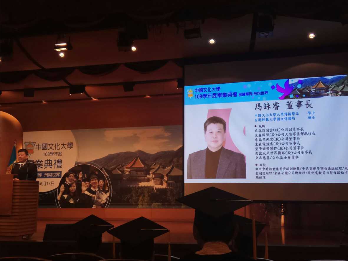 卅年前自文大新傳學院大傳系畢業的馬詠睿則贈語學弟妹:「快速行動、打破常規」,希望大家面對人生新挑戰,要讓自己力求改變,因為人生只能往前衝,沒有後退的機會。