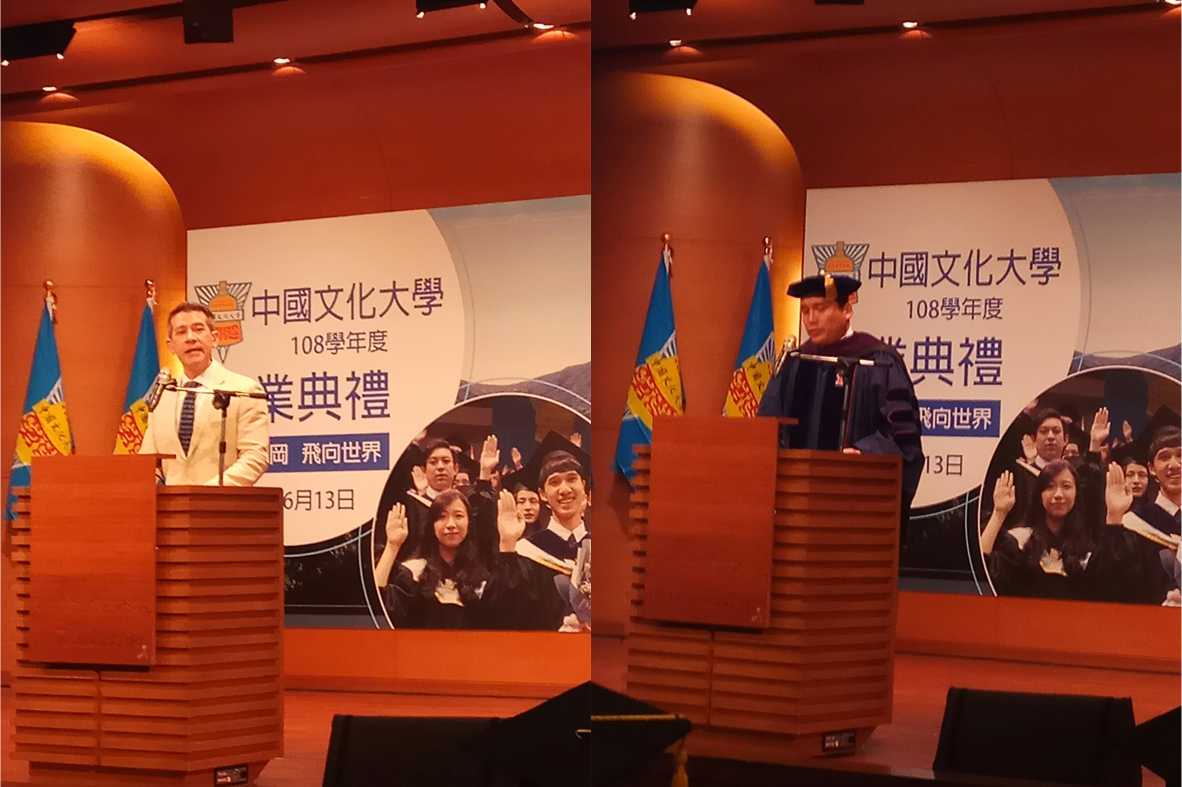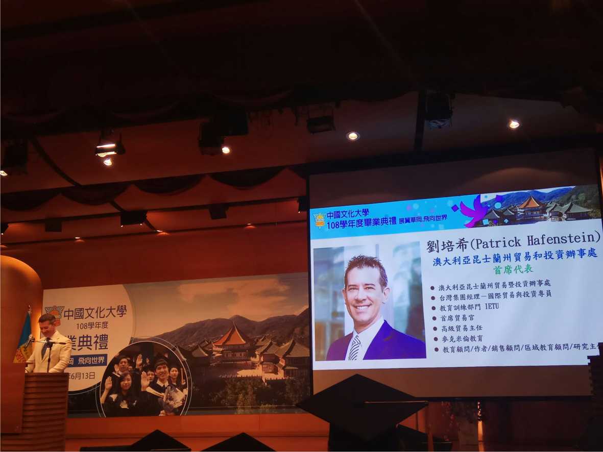 今年畢典邀請澳大利亞昆士蘭州貿易和投資辦事處首席代表劉培希(Patrick Hafenstein)以及東森新聞雲副董事長馬詠睿擔任致詞貴賓。劉培希說,因為疫情,讓各國看到台灣的實力,鼓勵台灣學生應該要有信心,積極培養國際視野,努力表現,驕傲地站在舞台上發光發亮。