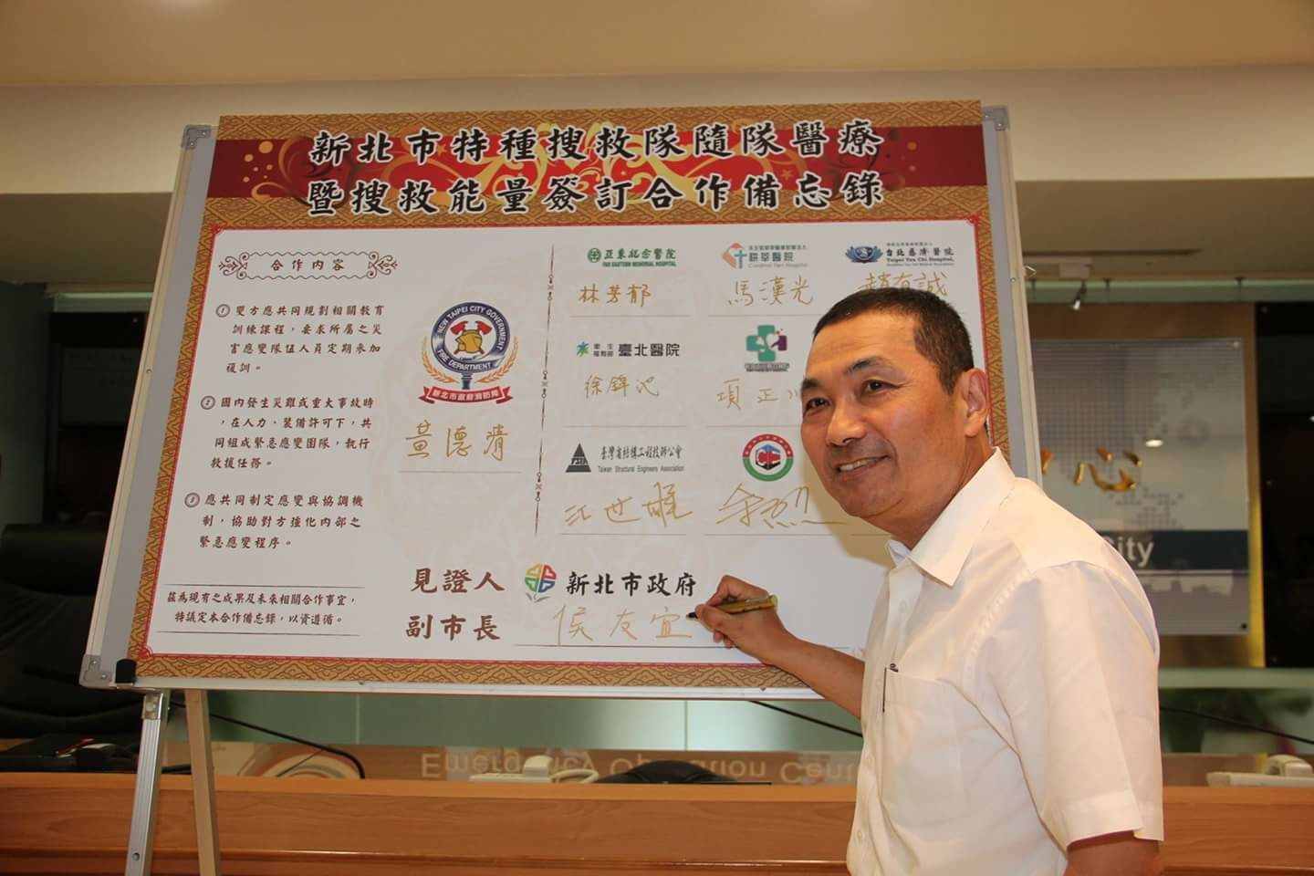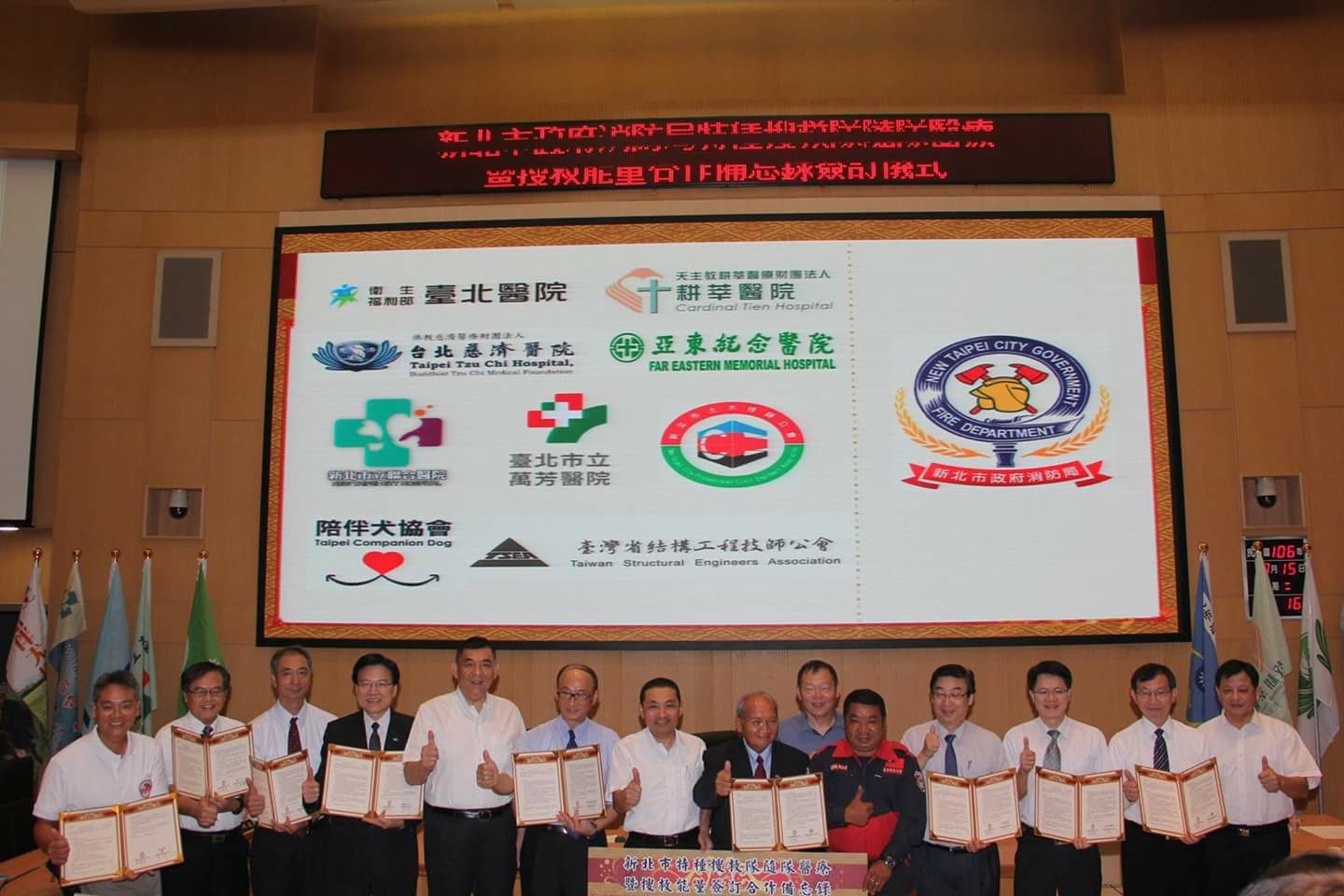 在侯友宜副市長見證下,消防局與雙北市醫院、土木、結構技師公會及陪伴犬協會等9個單位簽訂合作備忘錄(M.O.U),未來在重大災害現場中,16位醫院急診室醫師、20位土木及結構公會專業技師皆會主動前往災區協助,與搜救人員組成健全之救災隊伍。陪伴犬協會則負責協助搜救犬挑選、評量、訓練、出勤、獸醫照護及退役認養,給予救難小英雄最好的照顧。
