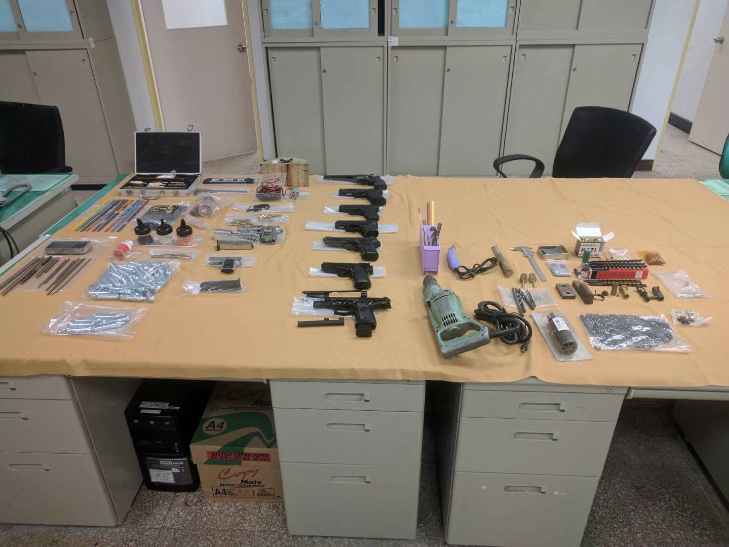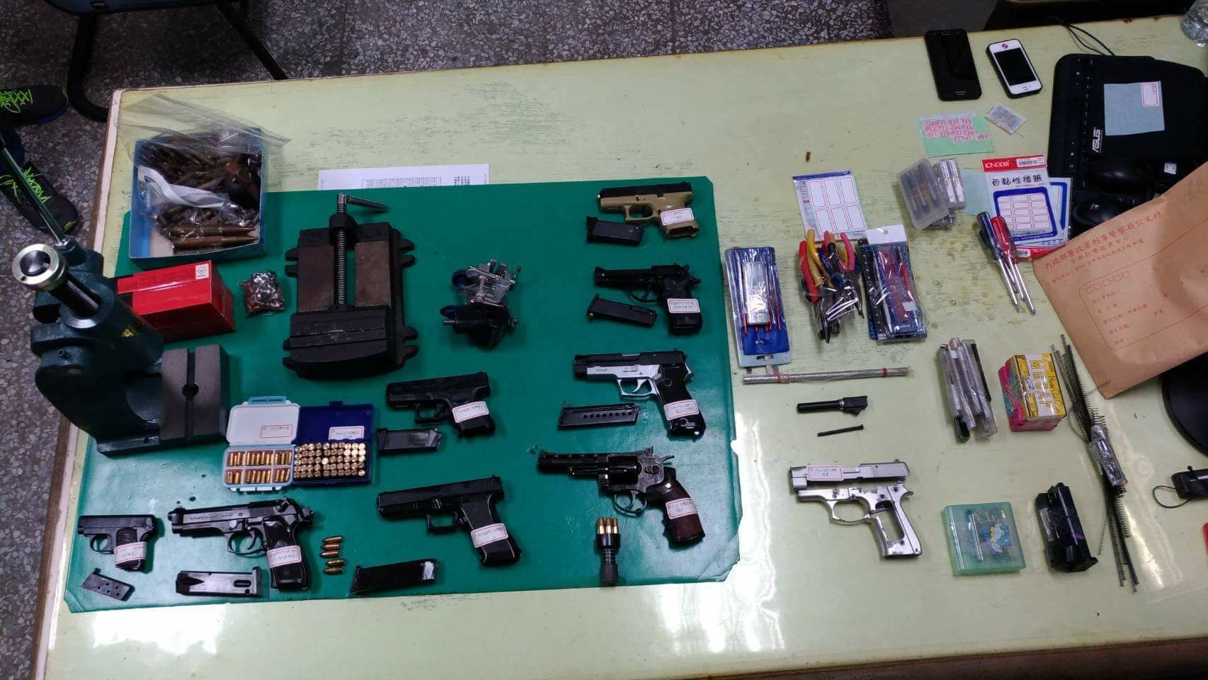 查獲改造槍械工廠4座、非法槍械111枝、子彈926顆、制式槍械5枝、土(改)造槍械62枝、其他槍械44枝,其中本局偵查第六大隊聯合基隆市等8縣市警察局於106年8月15日兵分多路同步執行拘提、搜索,計查獲槍械改造工廠3處、犯嫌19名,起獲改造手槍7枝、空氣槍16枝、子彈118顆。