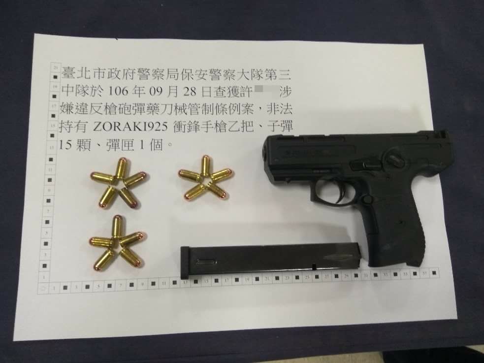 臺北市保安警察大隊第三中隊小隊長林秉紳率警員陳泳翰、廖三惠及于琦等4人,在臺北市松山區松河街2號前執行路檢勤務,見許姓男子騎乘機車途經該處,因神色異常緊張,員警請他接受盤查。當員警詢問許嫌身分年籍資料時,他又支吾其詞,引起員警高度懷疑,更突然發動機車引擎,狂催油門想逃跑,殊不知廖、于二員早有防備,迅速控制機車把手,許嫌見無法得逞,索性棄車逃跑,卻難敵敏捷的員警,不到數公尺就遭壓制在地。員警並發現許嫌腰際間有凸出異物,當場取出已裝上子彈之土耳其制式ZORAKI925全自動衝鋒手槍1枝(含彈匣1個內有子彈15顆),只要拉滑套就能擊發,員警見狀暗呼「好哩家在」。