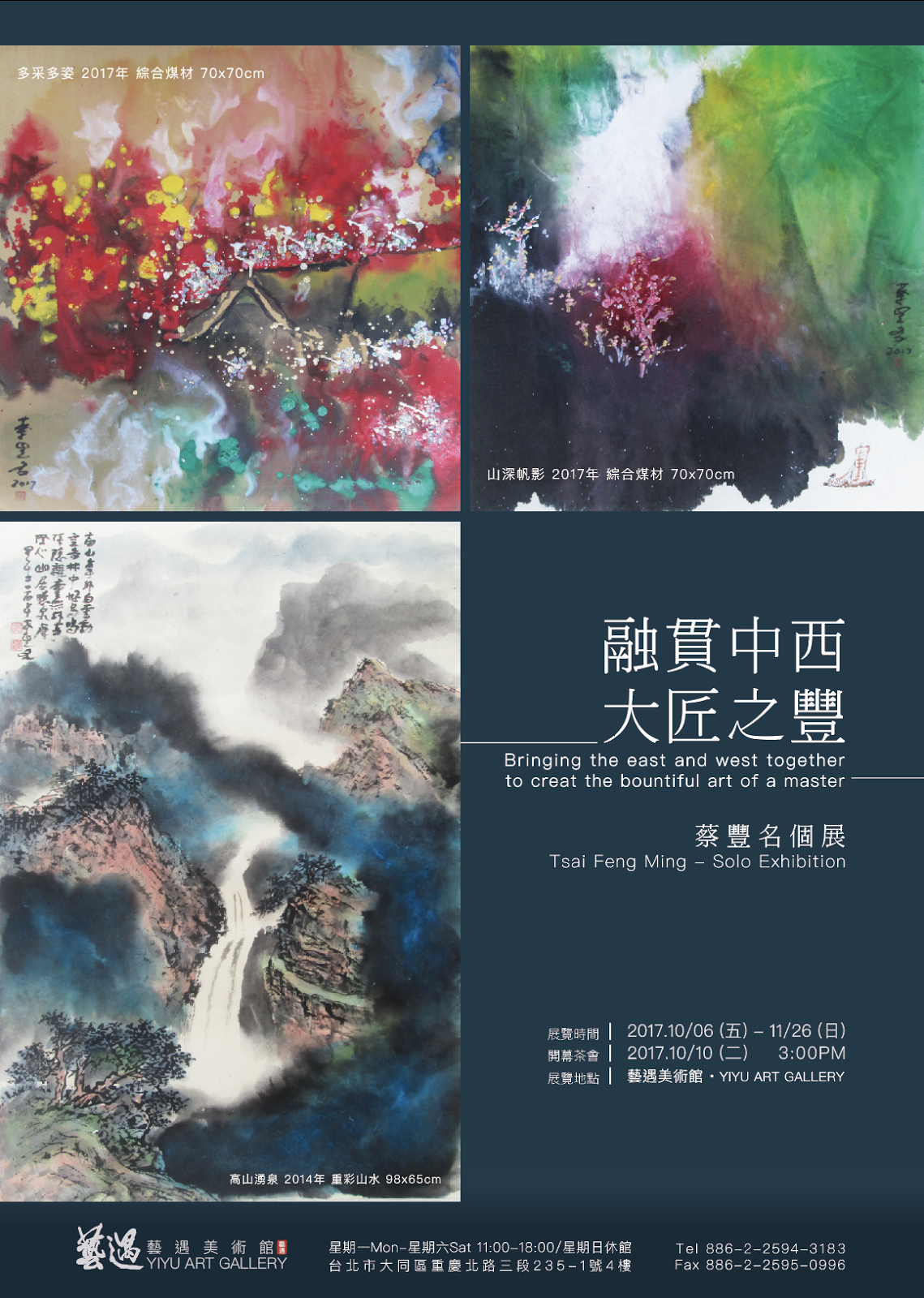 享譽國際藝術家 蔡豐名教授 “融貫中西、大匠之豐”展覽將在藝遇美術館舉行,本次展出中西繪畫作品, 2017年10月10日下午3點在 台北市大同區重慶北路三段235-1號4樓舉行開幕茶會歡迎參加。