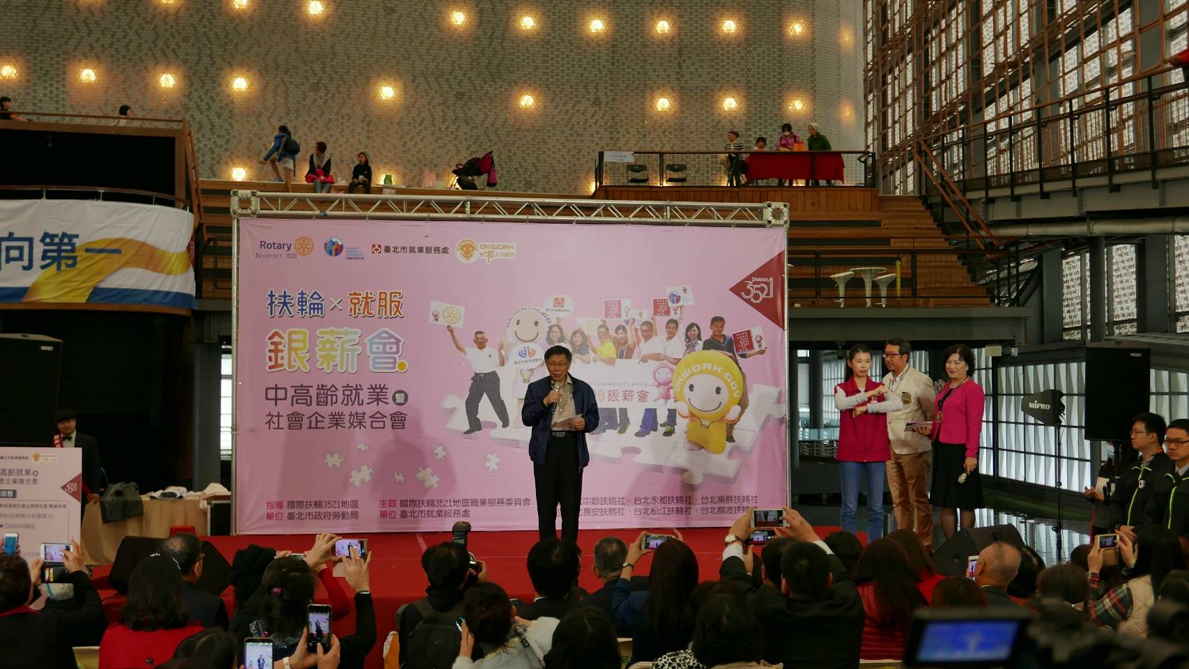 臺北市就業服務處與國際扶輪3521地區首度以中高齡就業為主題所舉辦的就業博覽會在臺北市花博流行館舉行,現場由扶輪社友提供27家企業、近300個工作機會。活動人潮從早上十時開始絡繹不絕,到下午三時三十分結束前,還有不少廠商還在面試排隊的求職者。初步統計吸引約1,637民眾前來參與,總計有1,213人投遞履歷。初媒人數670人,媒合率達55.2%。