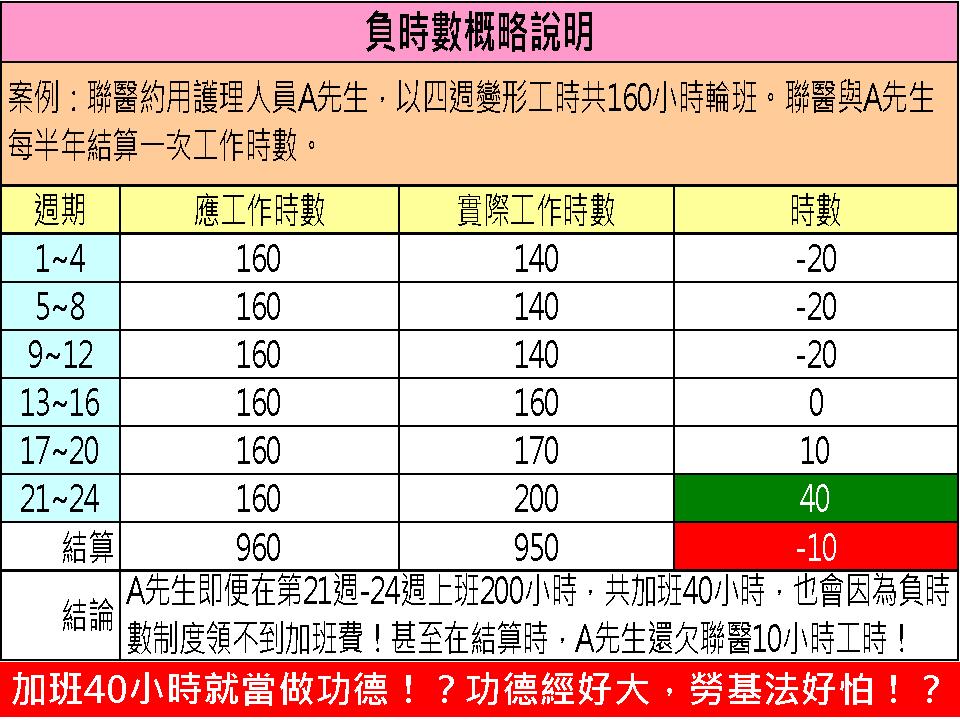 台北市聯合醫院企業工會表示,聯醫雖聲稱106年8月後終結「負時數制度」並給予加班費,但事實上,聯醫對於護理人員的加班費計算方式,竟以「違法的負時數制度」為前提加以換算。舉例來說,某護理人員自半年內的總加班時數為50小時,甚至某月達200小時加班時數,但因先前遭醫院指示提早下班共60小時,導致該護理人在結算時不僅領不到加班費,還欠醫院10小時的不合理狀況!工會更痛批,這樣的加班費計算合理嗎?!他們要求,聯醫應回歸勞基法的計算方式,重新計算加班費!