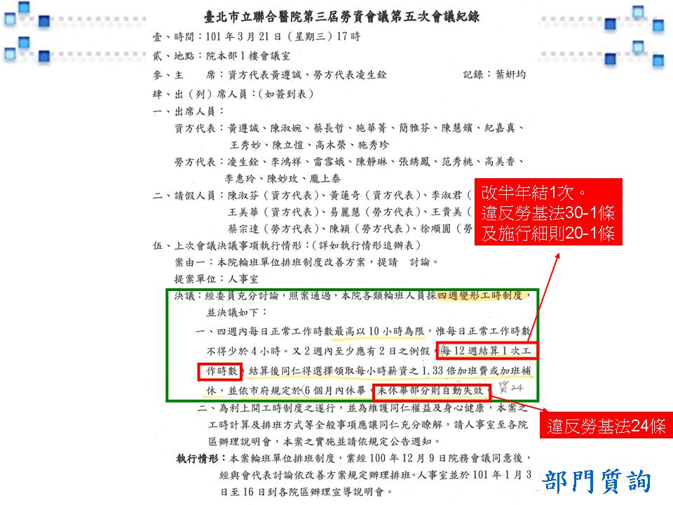 戴錫欽議員質疑,莫非聯醫是呼應賴揆的功德政策!?最扯的是,聯醫竟還訂定出違反勞基法的勞資決議,刻意欺騙護理人員,在在顯示勞工在勞基法上的弱勢!故要求,衛生局應偕同勞動局主動介入了解聯醫與護理人員間的勞資爭議,依法處理!此外,相較於北市其他醫院,聯醫護病比仍顯過高,也因護理人員長期不足,導致護理人員加班率高,加班時數過長等亂象叢生,衛生局應提出改善對策以因應,避免聯醫被掛上血汗醫院及功德醫院的汙名!