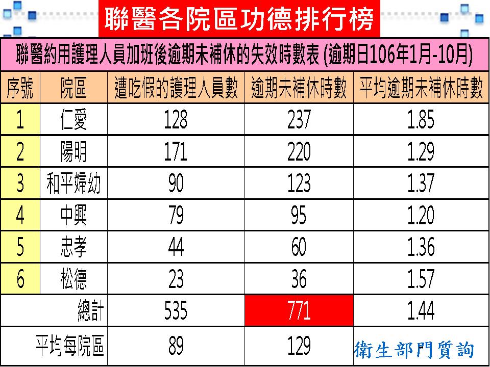 據資料顯示,有535位聯醫護理人員因先前加班但來不及在半年內補休遭吃假,聯醫在106年1月至10月就吃假771小時,平均每位護理人員被吃假1.44小時!若以護理人員加班後逾期未補休的失效時數排行榜來看,功德醫院第一名是仁愛院區,逾期未補休時數共237小時,有128位護理人員遭吃假,平均每位護理人員逾期未補休時數1.85小時,第二名至第六名分別為陽明院區220小時、和平婦幼院區90小時、中興院區79小時、忠孝院區44小時及松德院區23小時。