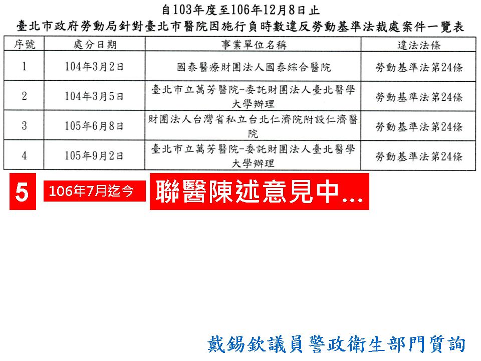 戴議員發現,聯醫除了是功德醫院外,更是血汗醫院!聯醫月均護理人員1,554名,竟出現月均1,509名護理人員申請加班,護理人員加班率竟97%!若以各院區「月均加班超過20小時」的護理人員數來看,血汗醫院前三名分別是「和平婦幼院區49人、仁愛院區26人、陽明院區9人」。