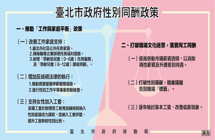 臺北市政府勞動局長賴香伶表示,性別同酬不會自達完成,想要縮小性別薪資差距,要先從改變社會對男女兩性在工作和家庭中扮演的角色給出的文化設定,包括消除性別刻板印象,縮小職業性別隔離,建立友善職場等,除此之外,應具體改善育兒環境,因此,106年12月16日率先由臺北市長柯文哲發布「臺北市政府性別同酬政策」。