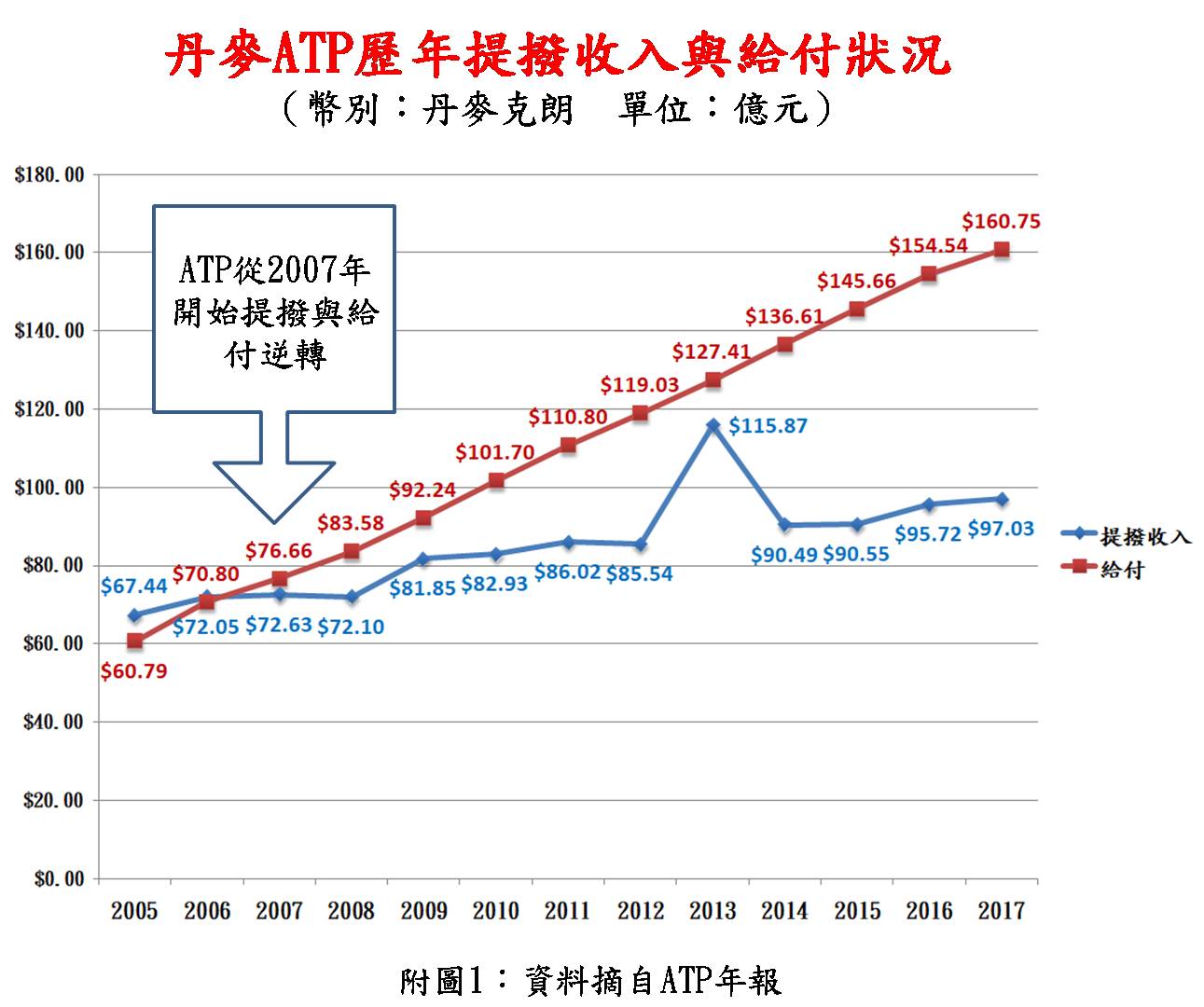 ATP究竟於何年開始提撥收入與給付逆轉呢?答案是2007年。在2006年時,ATP的提撥收入約為72.05億元,給付為70.8億元,2007年開始逆轉,提撥收入約為72.63億元,給付為76.66億元,之後就開始一路逆轉,差距越來越大(附圖1)。