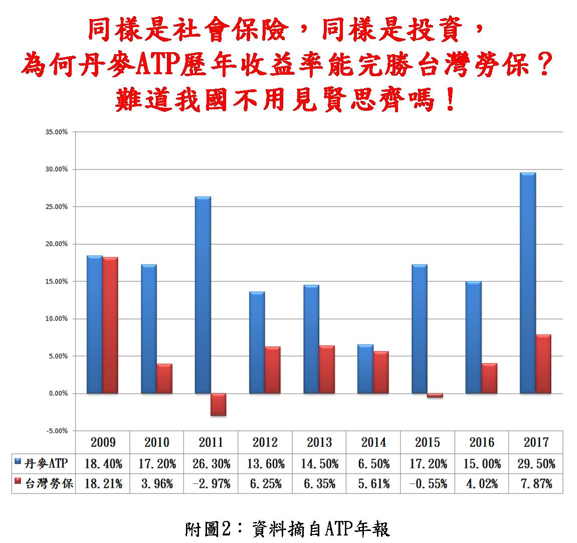 自2009~2017年這九年中,ATP的投資績效完勝勞保,除了2009和2014年的投資績效與勞保比較接近之外,其他年ATP(除了2011 & 2015年)的投資績效皆為勞保的2~4倍,至於2011年和2015年的表現則更為優異,因為這兩年勞保的投資績效是負值(虧損),而ATP的投資收益率分別為26%和17.2%(附圖2)。2017年,當政府為勞保7.87%的投資績效得意洋洋時,ATP更創下29.5%的佳績。