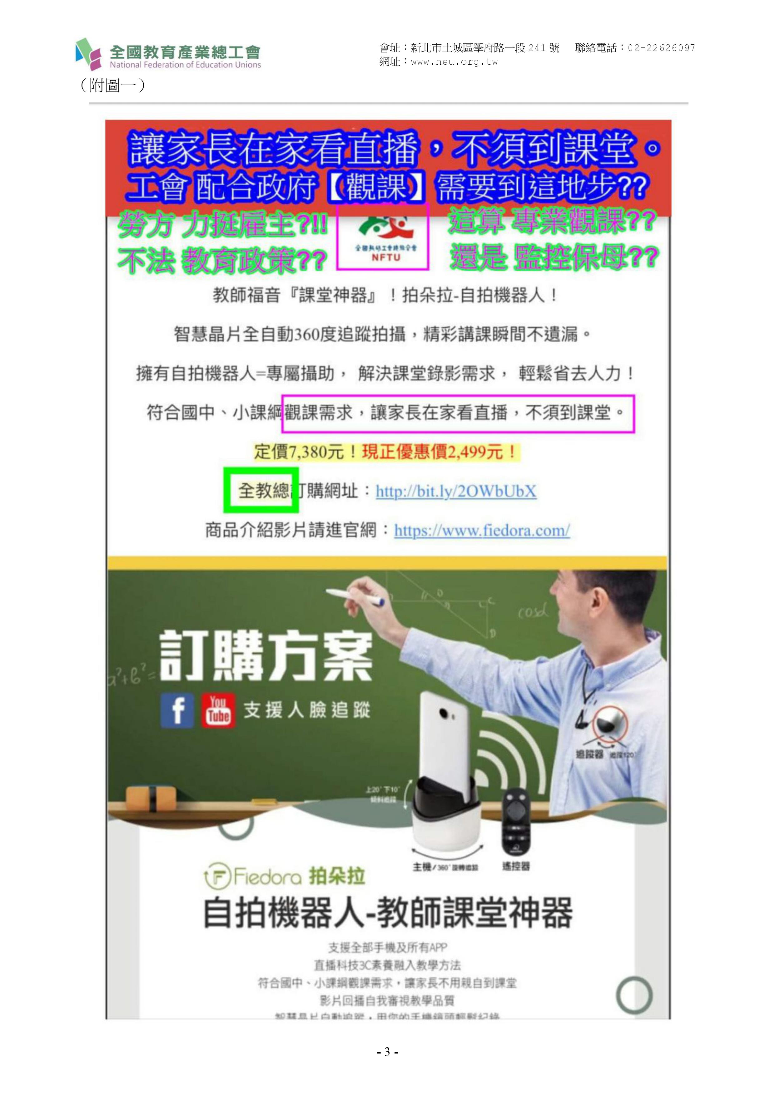 此外,教育部與【全教會(總)】共同推動之「教師專業發展支持系統」中之重點項目在「觀課」與「議課」,106年12月19日,教育部便將「觀課」明列於「十二年國教總綱」之中,明訂「為持續提升教學品質及學生學習成效,形塑同儕共學之教學文化,108學年度起,國小至高中的校長及教師,每學年應至少公開授課一次。」【全教總】除領取教育部大筆經費外,也配合政府在網站上公開團購教室用「觀課機器人」,並於文宣中強調「家長可在家看直播」(附圖一)。教師授課變成「楚門的世界」,對於學生學習真的有幫助嗎?