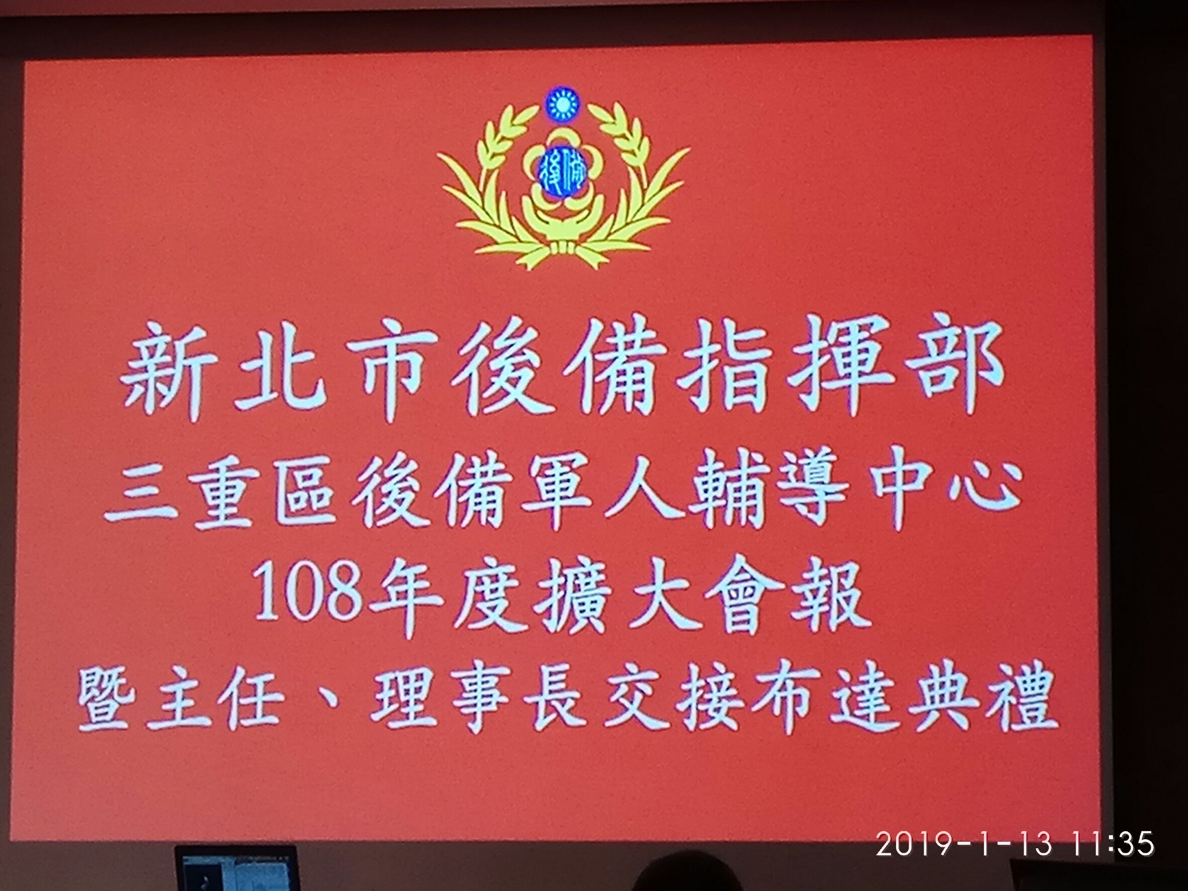 新北市後備指揮部三重區後備軍人輔導中心,108年1月13日由張主任軒杰召開108年輔導員以上輔導幹部擴大會議,並由即將卸任李秘書仁山依程序宣(轉)達「上級交辦事項」、「當前政策與工作重點」、「108年1月21日頒發優秀後備軍人暨子女獎學金」、「108年1月29日於後備動員幹部訓練中心辦理晉任及優秀表揚」、「輔導組織、服務、宣傳及安全四大工作」及中心各辦理事項,會中張主任及李秘書感謝三重區各督導、組長、輔導員在4年任期內之外,回顧過去新北市後備指揮部給予中心的肯定,都是來自輔導幹部共同齊心努力的結果,於此特別由衷表示萬分謝意。